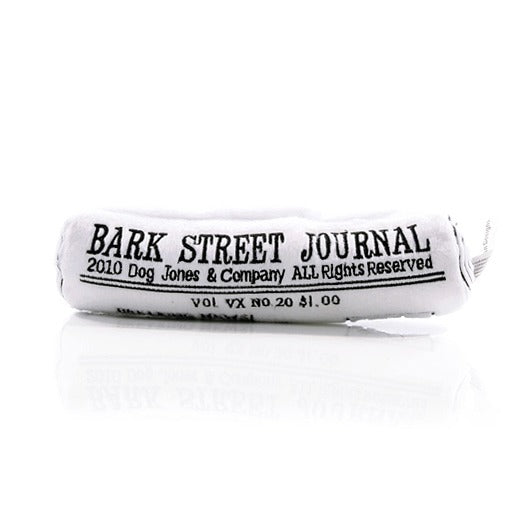 A newspaper your dog can chew! The plush novelty Bark Street Journal newspaper dog toy features an inside squeaker and crinkle sound effect to keep your dog entertained for hours of play! Perfect for small to medium dogs. Measures approximately 9" long.